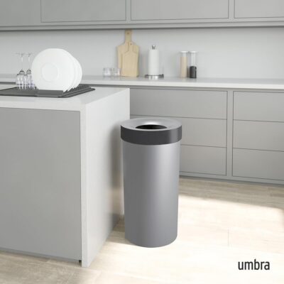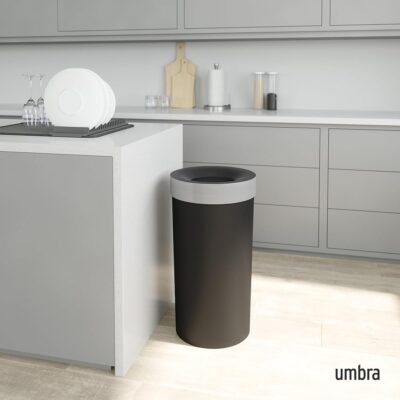 $43.13- SIMPLE CLEAN DESIGN Designed by Umbra, VENTI Trash Can has a simple yet effective design that looks great with any decor; the swing-top lid keeps garbage out of sight while the neck ring both holds and conceals the bag for a clean, modern look.
