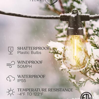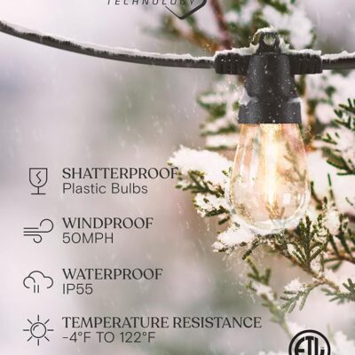 - Commercial Grade WeatherProof Patio Lights with Shatterproof S14 Bulbs: Brightech’s Ambience Pros hanging string light has our WeatherTite technology - withstood winds up to 50MPH, rain & snow. The bulbs are shatterproof plastic shells, with heat resistance up to 122 degrees Fahrenheit. Flexible heavy-duty cord withstands the wear of indoor and outdoor use. Make your pergola, porch or other space to be an enticing, relaxing and soothing winter holiday retreat with Brightech LED outdoor lights.