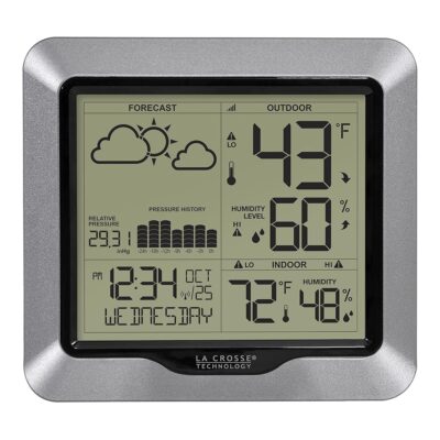 - The weather station provides temperature, humidity, alerts, comfort level color bar both for indoor and outdoor (La Crosse Technology C85845-INT).
