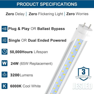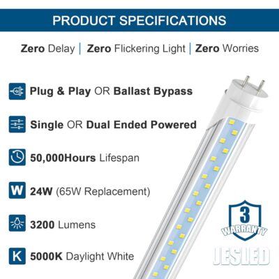 - 【BRIGHT, ENERGY SAVING】- JESLED dual row 4ft T8 LED tube can illuminate your space with 3200+ lumens (>130lm/w). Instantly economize 65% on your electricity bill when you replace 65watt old fluorescent tubes with JESLED high output 24watt 4ft LED light bulbs.