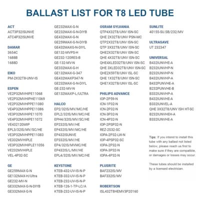 $114.99- 【PLUG & PLAY OR BALLAST BYPASS】- JESLED T8 4Foot Type A+B LED light bulbs can be installed with a ballast( Plug & Play) or without a ballast (BALLAST BYPASS), making LED conversion fast, simple and secure. Check ballast list for compatibility.(Note: Our 4 foot t8 led bulbs don't compatible with dimming ballast, please do not use it with our lights.)